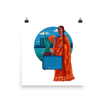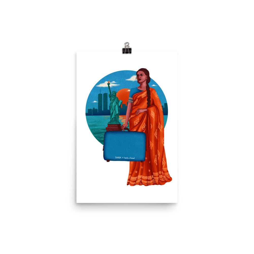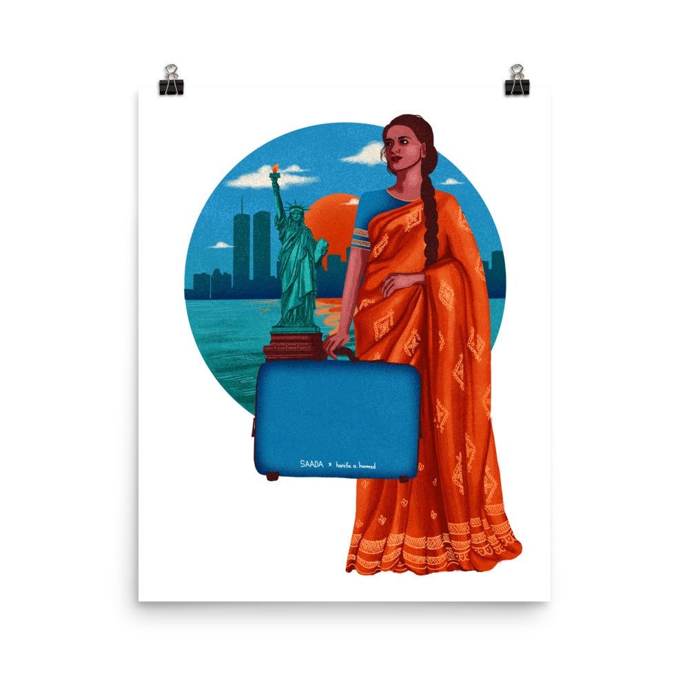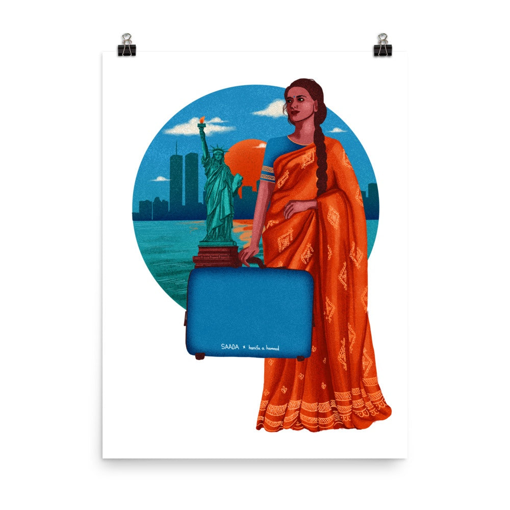 Hanifa Hameed's artwork for "Arrival" was inspired by the story of Lakshmy Parameswaran's journey from India to the U.S. in 1973, when she was 24 years old. In her interview for SAADA’s First Days Project, which preserves the experiences of immigrants’ and refugees’ experiences of arrival in the U.S., she describes her initial excitement and the reality of exhaustion on her first day in New York.