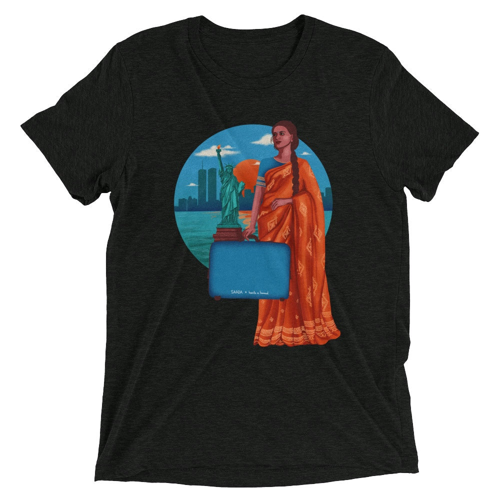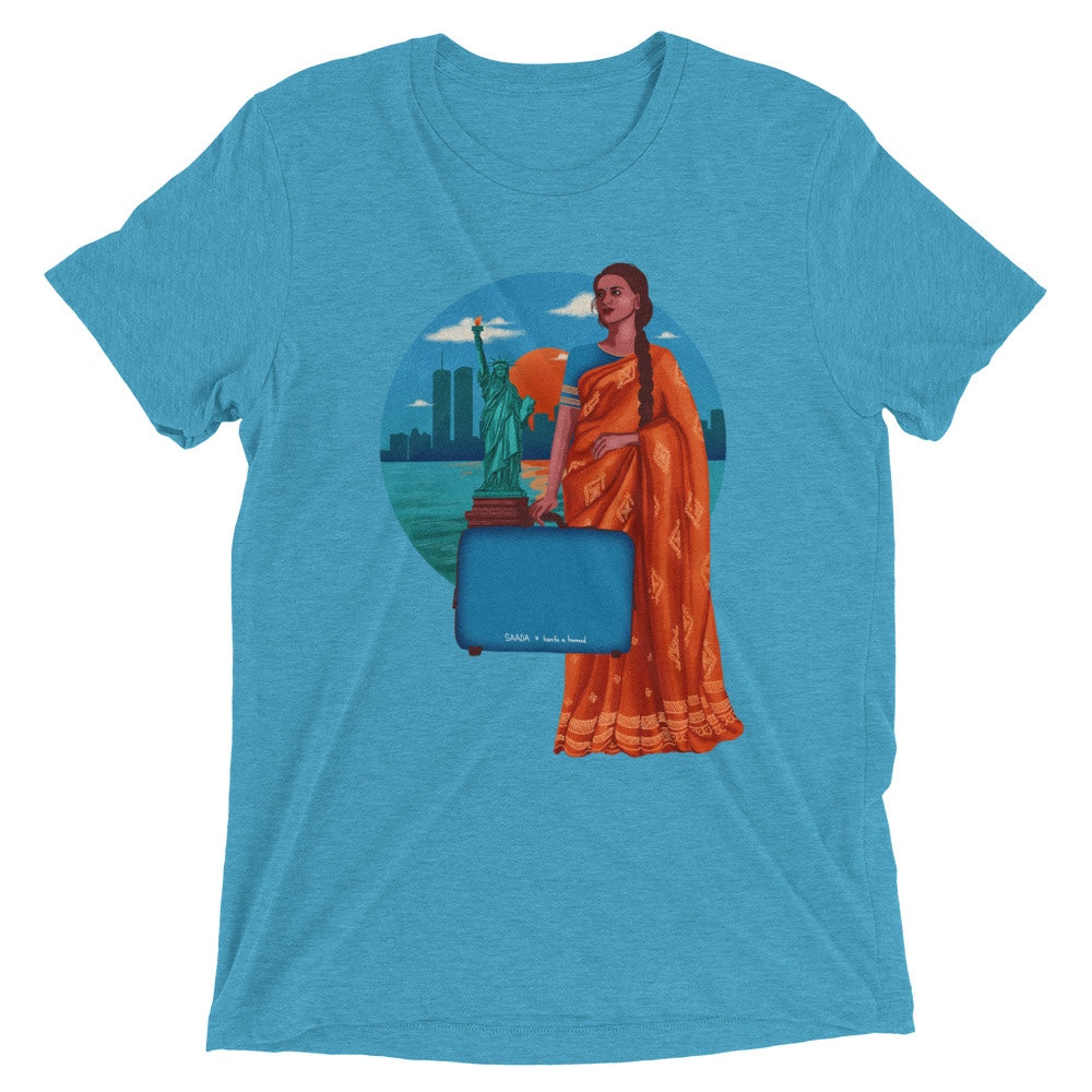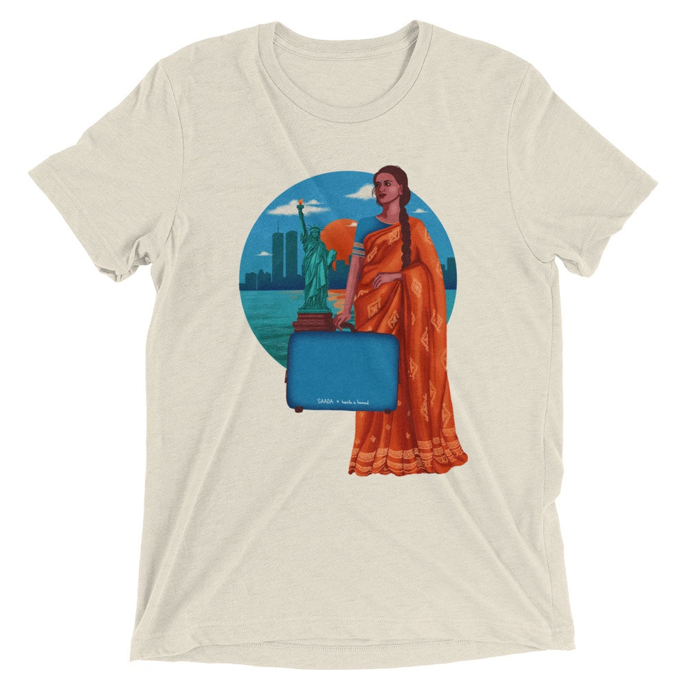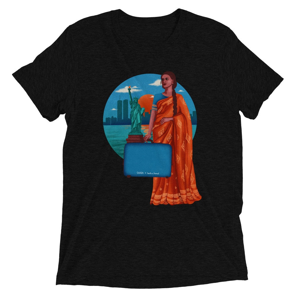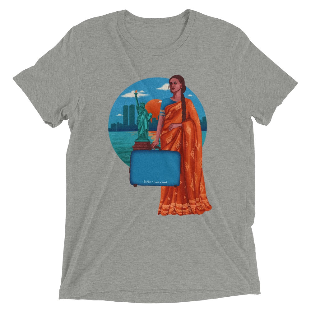 Hanifa Hameed's artwork for "Arrival" was inspired by the story of Lakshmy Parameswaran's journey from India to the U.S. in 1973, when she was 24 years old.