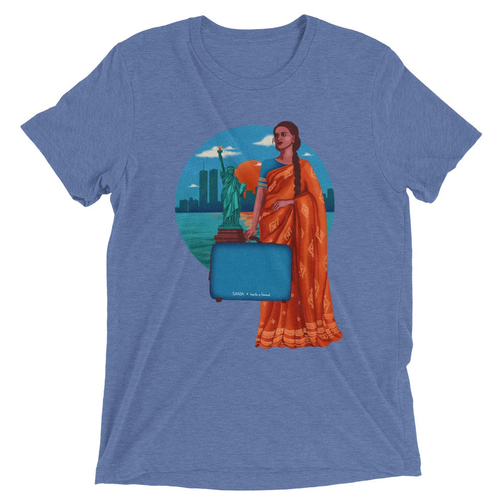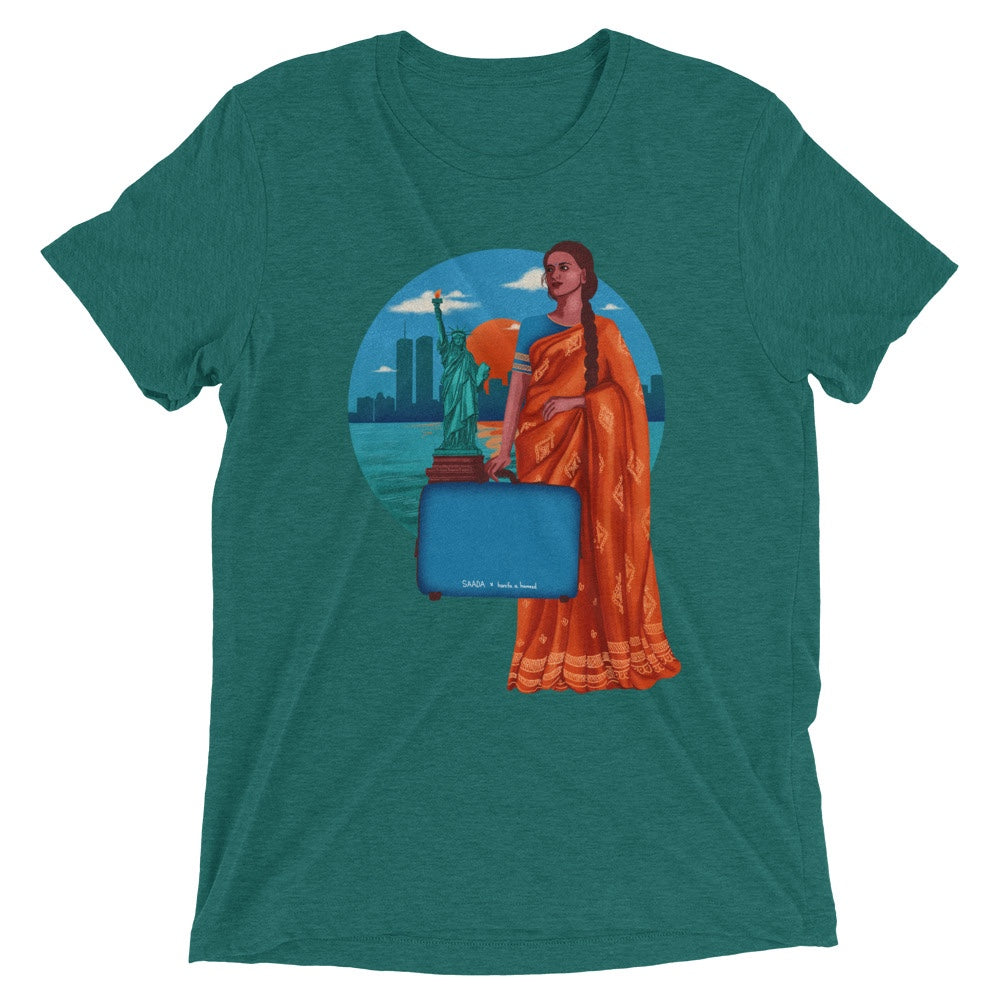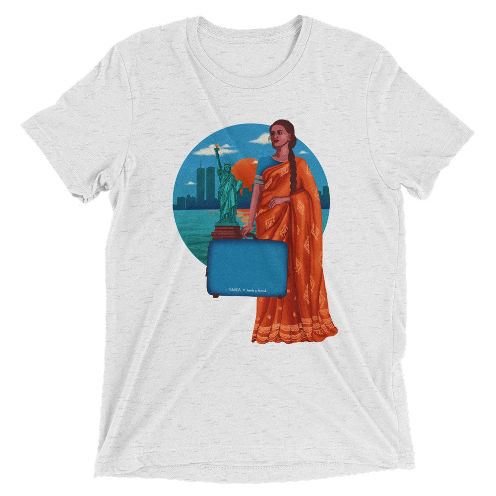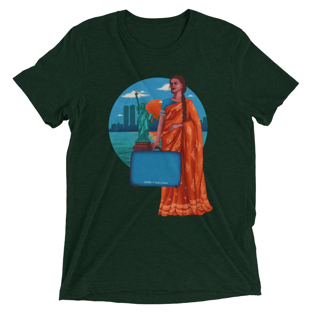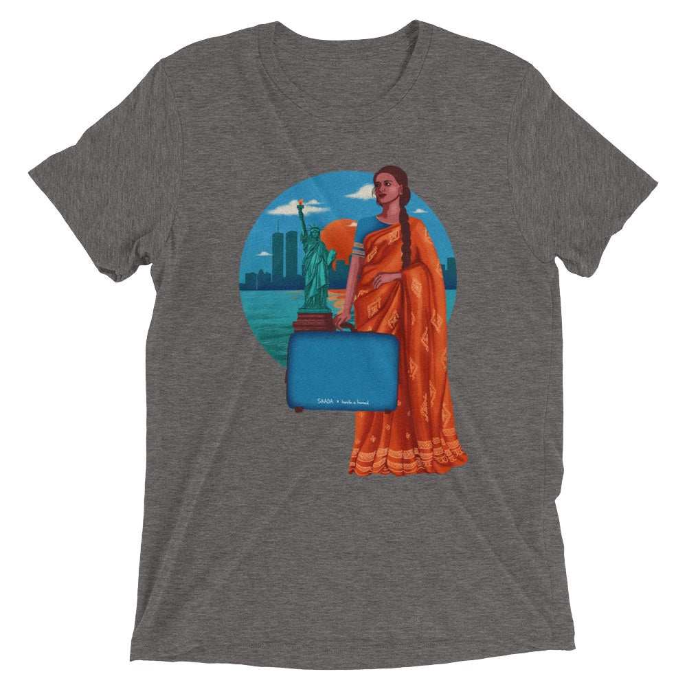 Hanifa Hameed's artwork for "Arrival" was inspired by the story of Lakshmy Parameswaran's journey from India to the U.S. in 1973, when she was 24 years old.