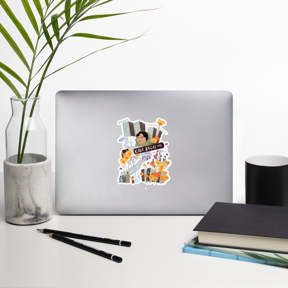Shurjo Mukhi’s artwork for “Coming Home” was inspired by the campaign that successfully renamed a section of Shattuck Avenue in downtown Berkeley as Kala Bagai Way, as shared in the “Kala Bagai” essay in Our Stories.